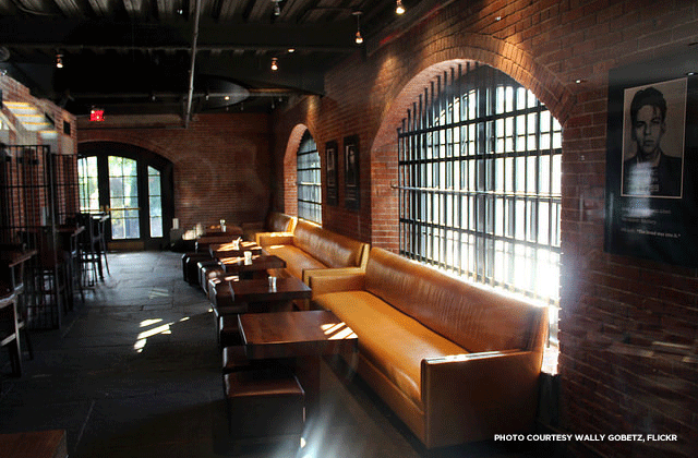 The Alibi Bar ironically is located in what used to be the jail’s “drunk-tank”. It features the original jail’s brick walls and bluestone floors. Additions to keep the jail theme include: mug shot photographs, jail inspired artwork and prison bars along the windows and walls. Even the menu has been designed to reflect the prison theme and includes the cocktails Doin’ Thyme and Jail Bait. The bar is known to fill up quickly, however in the summertime the overflow is welcomed into a 100-seat patio area. If you’re interested in an unique hotel or dining experience (not too far away) check out the historic Boston hotel The Liberty and The Alibi Bar.